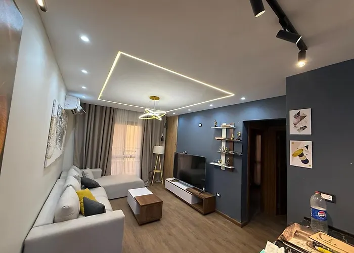 20 Min To The Airport New Cairo Apartment offers a balcony, a living room, and a well-equipped kitchen with views of the garden and comforts like an air conditioner.
